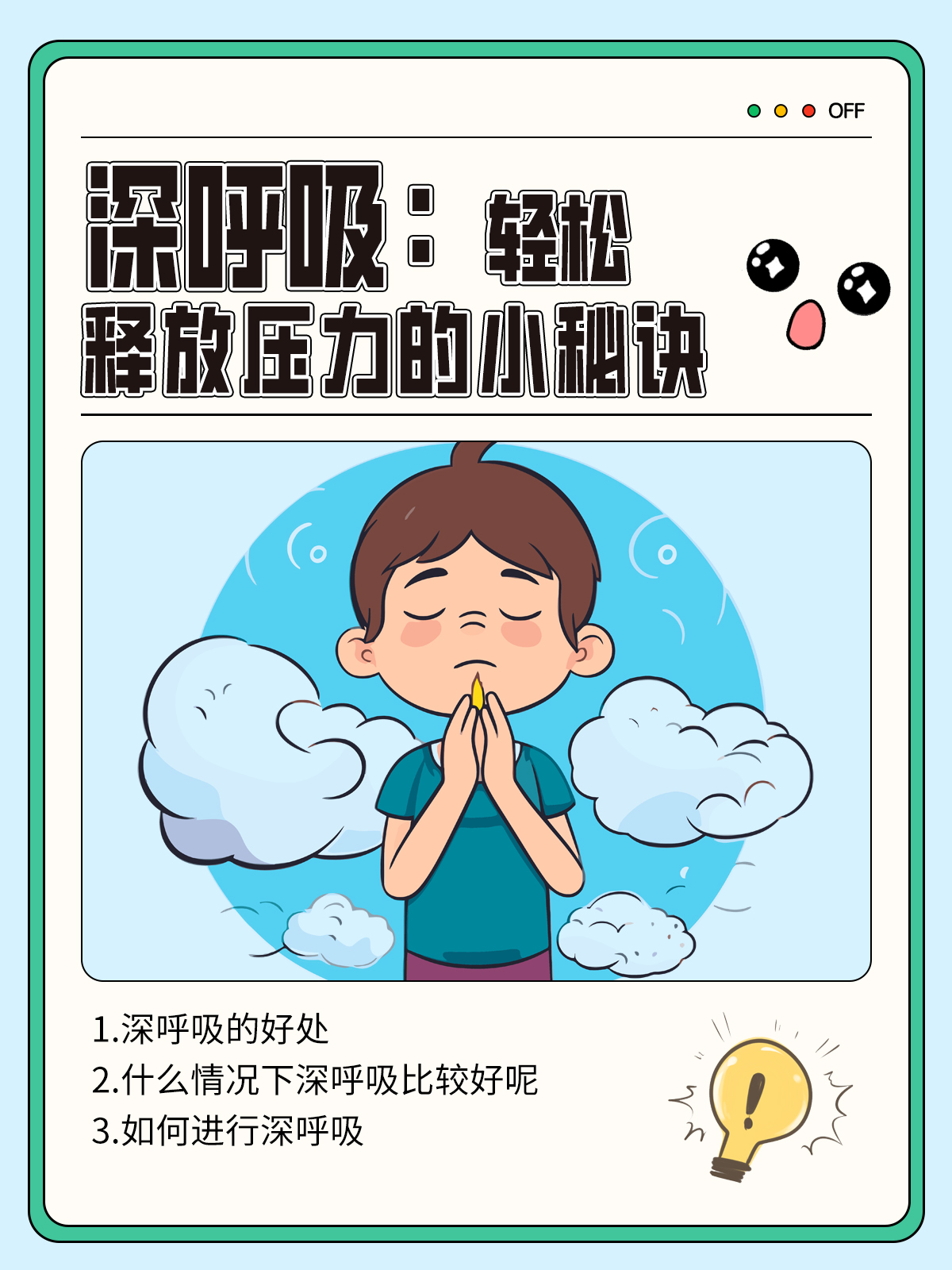2、遇到困難時(shí)深呼吸:在面對(duì)困難時(shí),深呼吸有助于你保持冷靜,思考解決問題的方法。